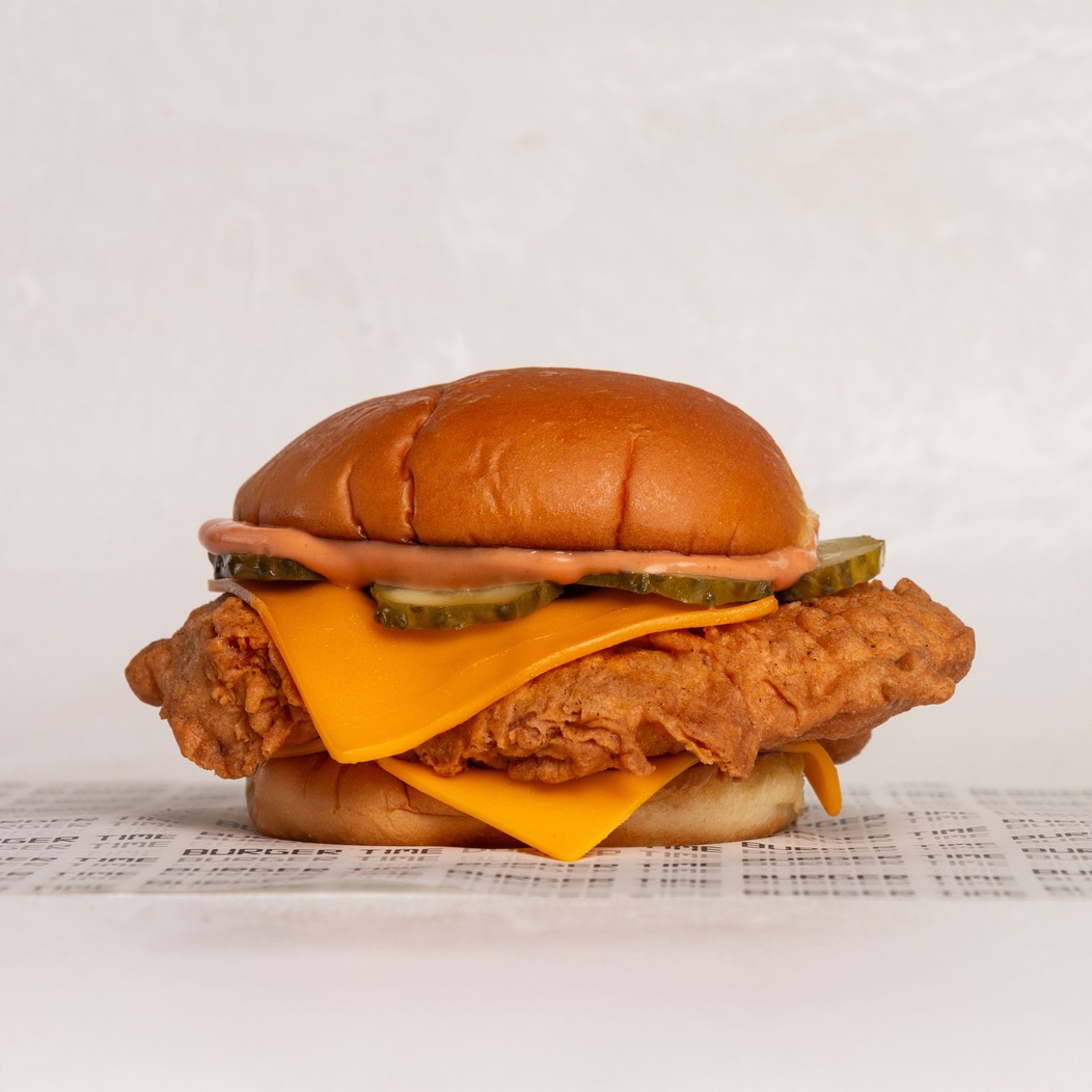 Pan Martin’s, queso cheddar, pollo rebozado, pepinillo y salsa BT